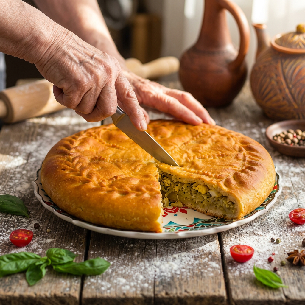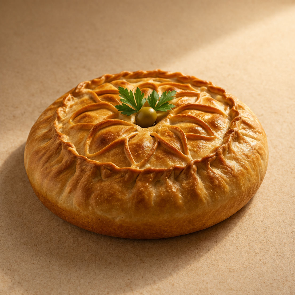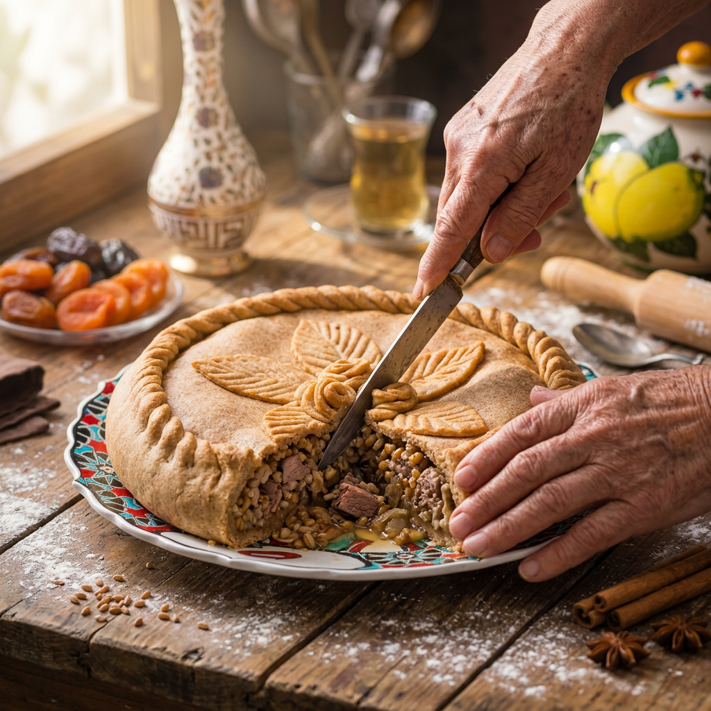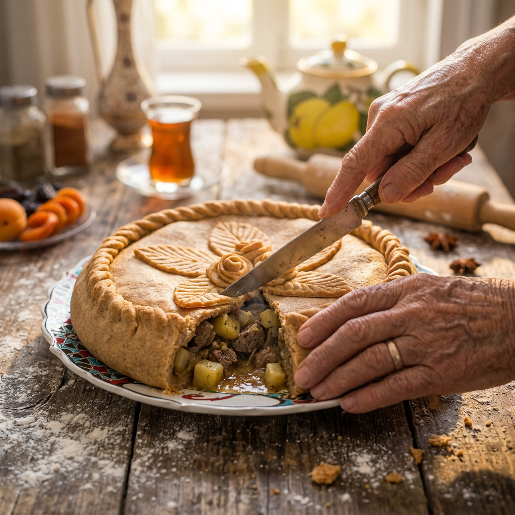 Большой татарский пирог на 1,5 кг. Говядина нарезана кубиком 2 на 2 см, внутри также картофель, лук и сливочное масло. Мясо томится в тесте и сохраняет весь сок.