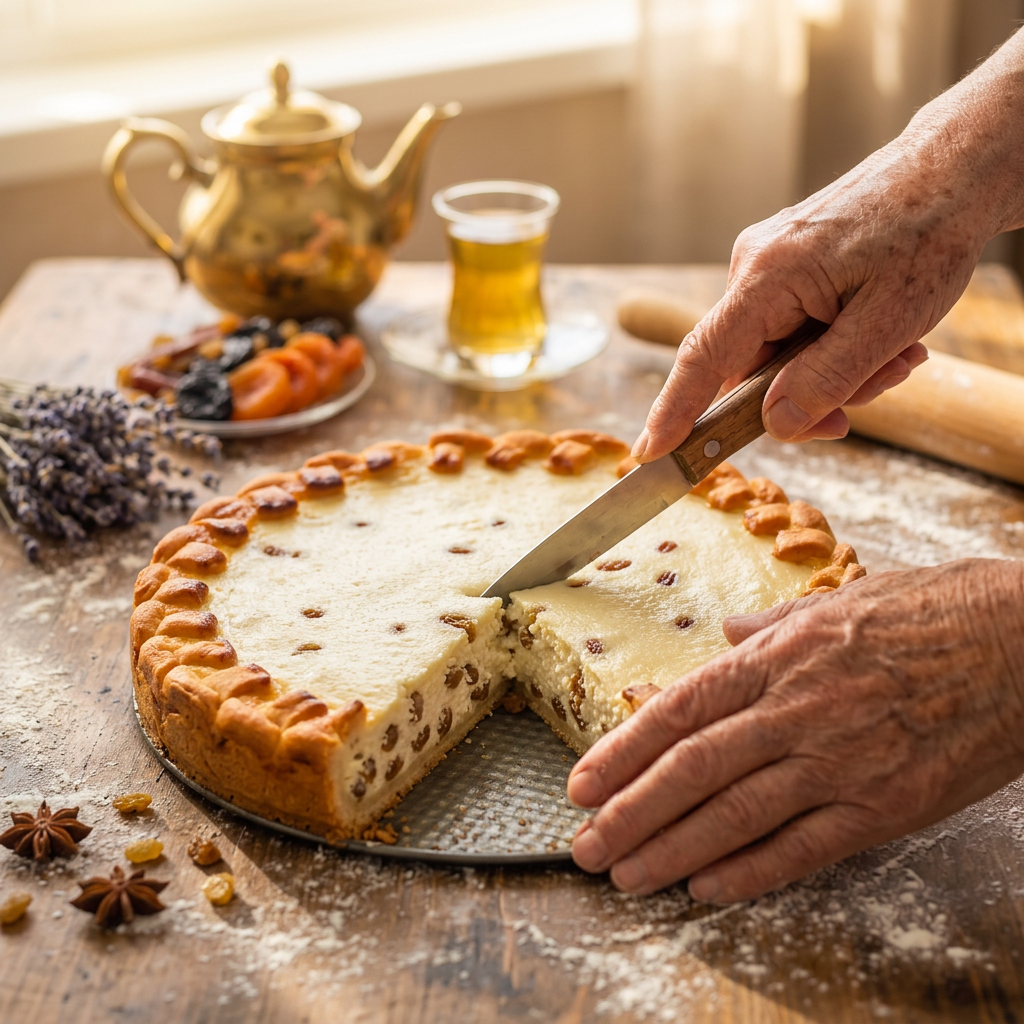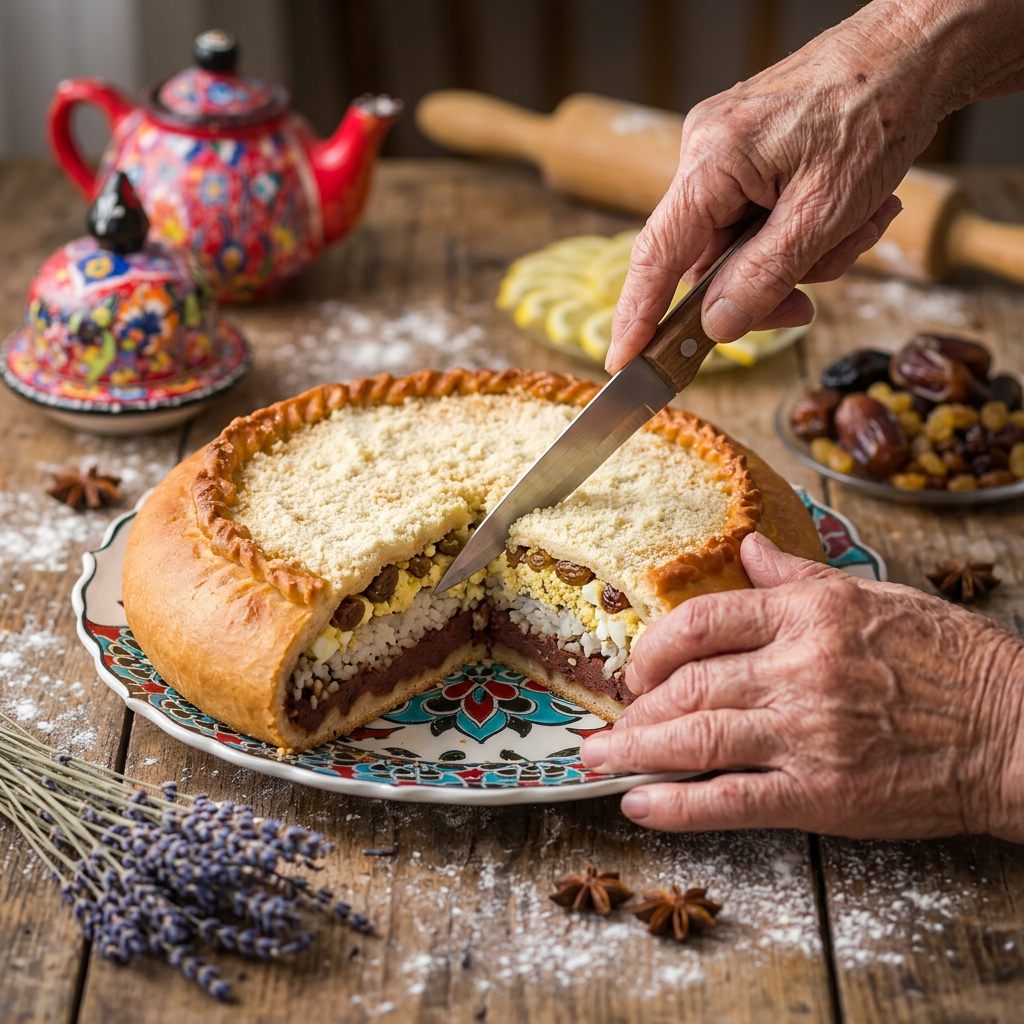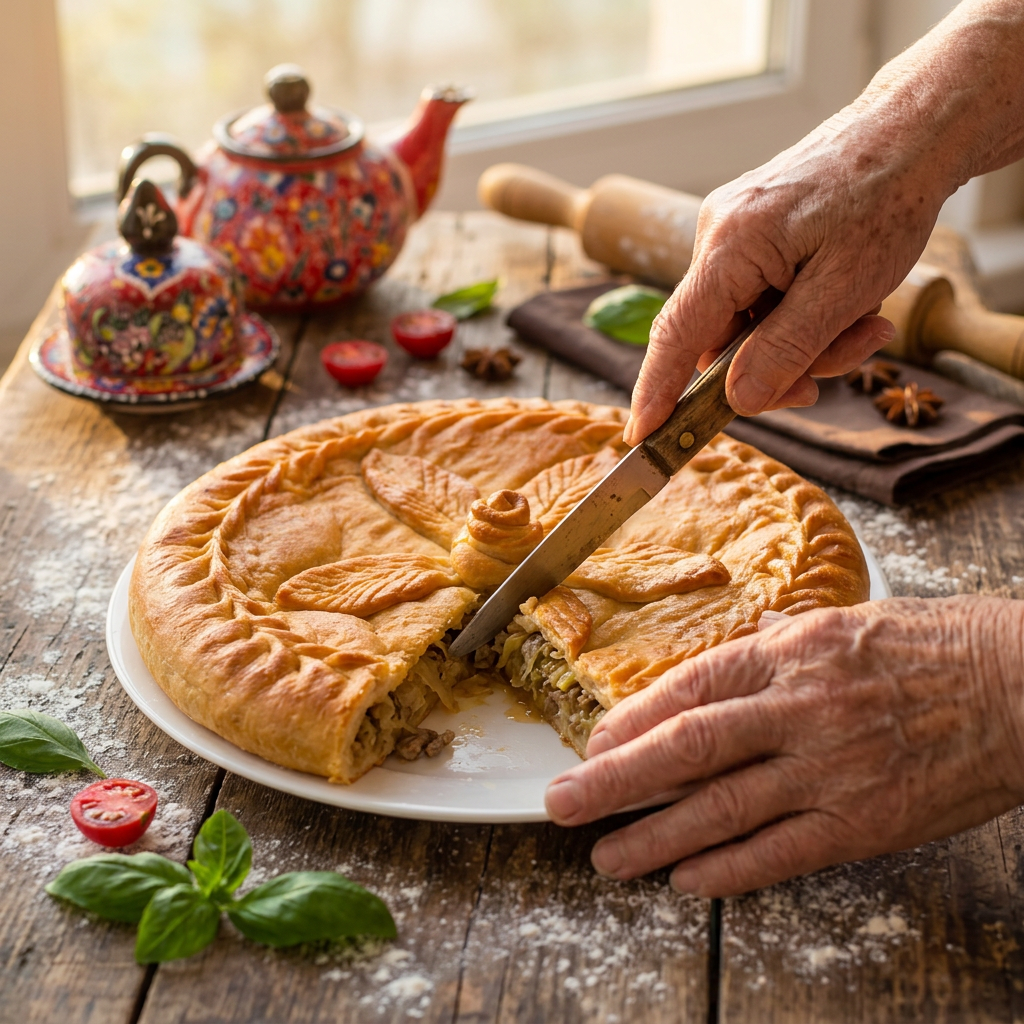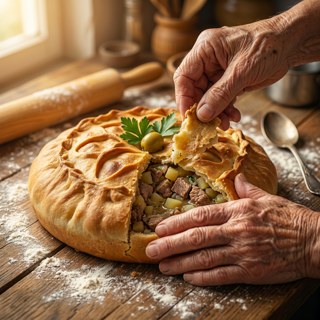 Большой татарский пирог на 1,5 кг. Говядина нарезана кубиком 2 на 2 см, внутри также картофель, лук и сливочное масло. Мясо томится в тесте и сохраняет весь сок.