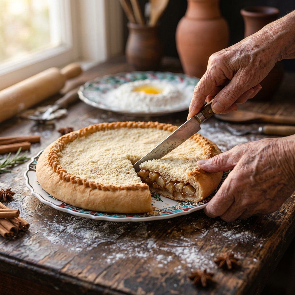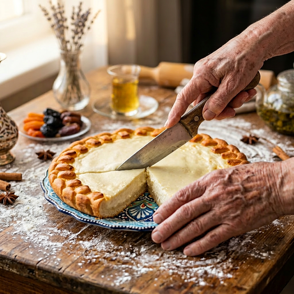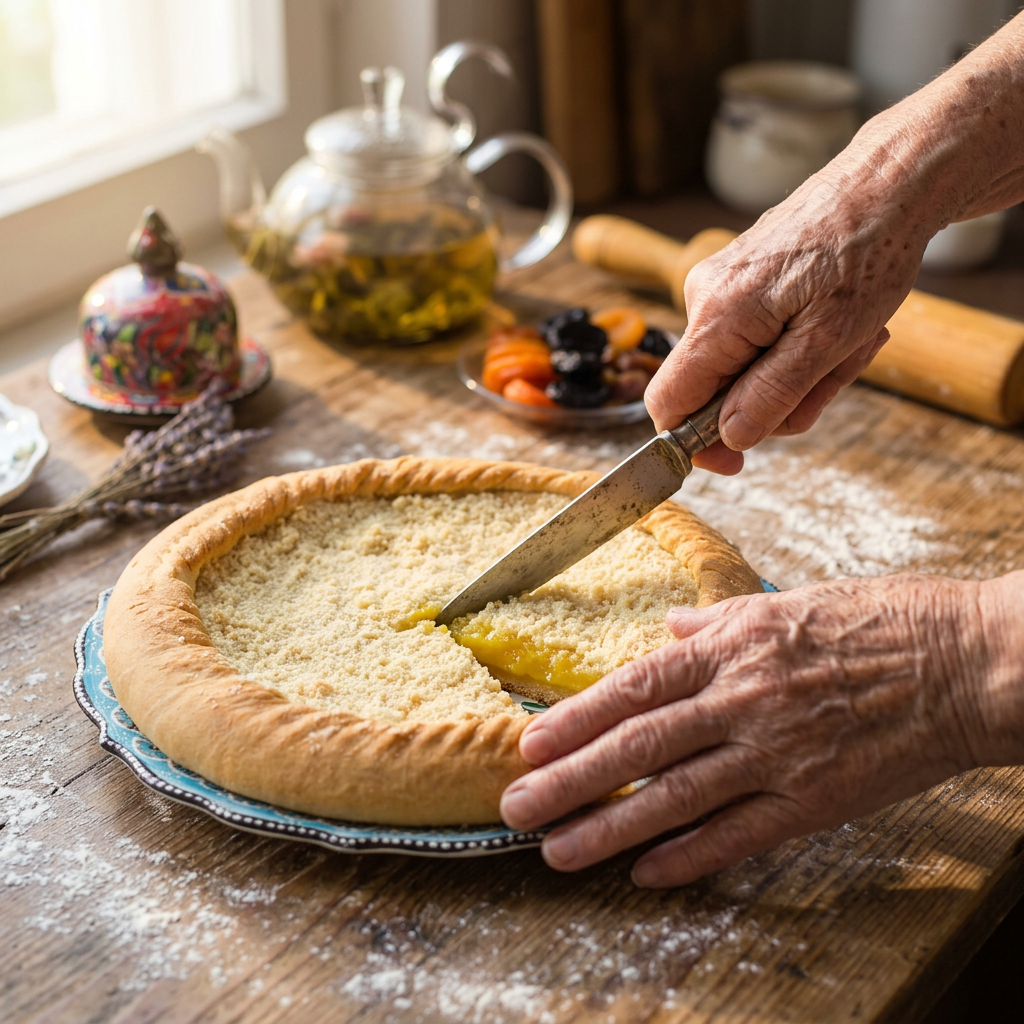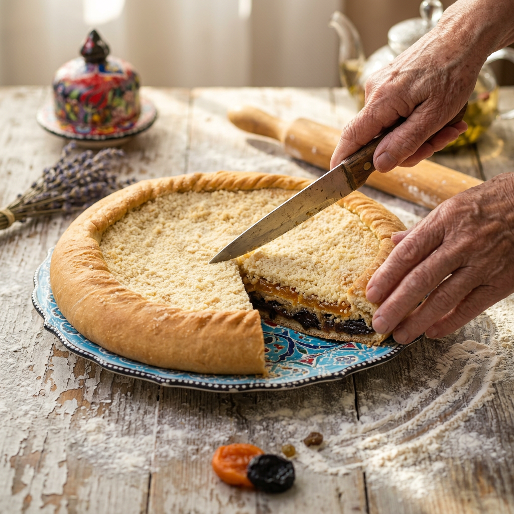 Большой татарский пирог на 1,5 кг. Говядина нарезана кубиком 2 на 2 см, внутри также картофель, лук и сливочное масло. Мясо томится в тесте и сохраняет весь сок.