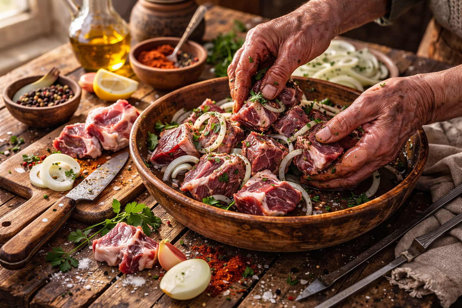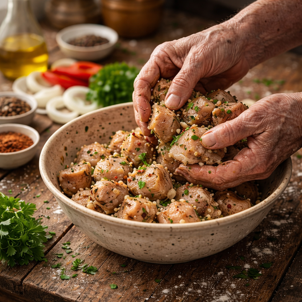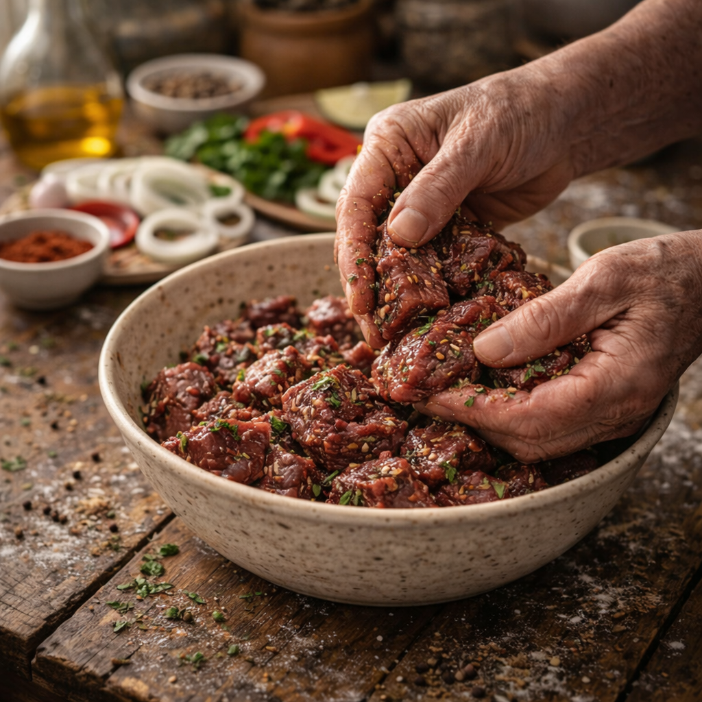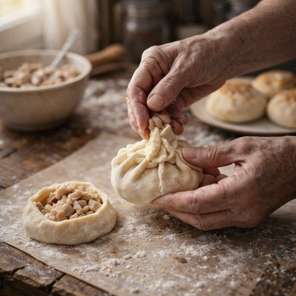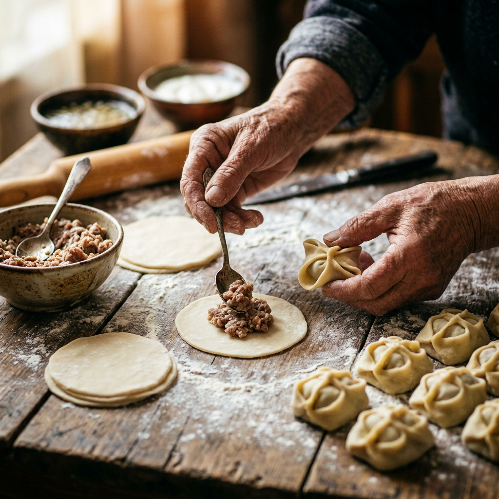 Манты лепятся вручную из тонкого пшеничного теста. Внутри — рубленая говядина с картофелем, луком и зирой: насыщенная начинка с восточным ароматом специй.