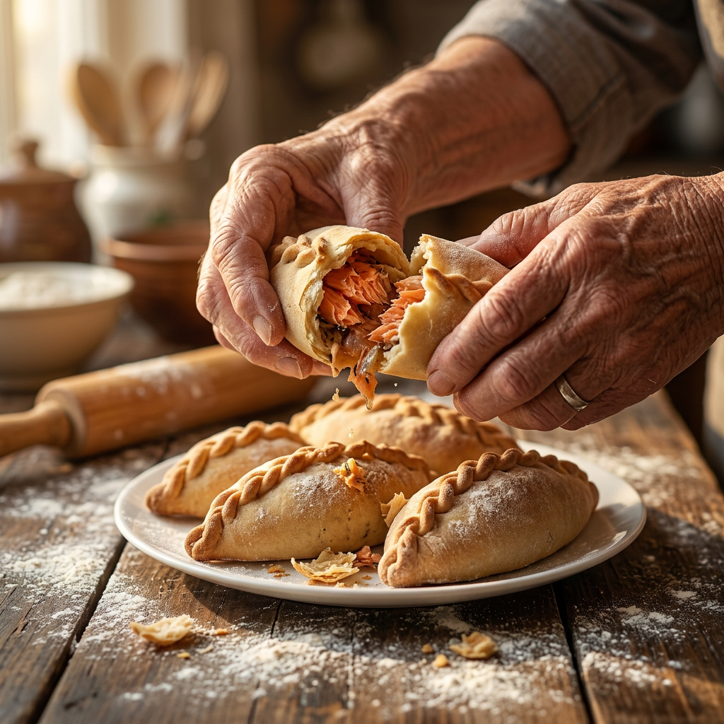 Маленький татарский эчпочмак весом 60 г. Внутри рубленая говядина с картофелем и луком в яичном тесте. Запечь в духовке 20 минут — и готово к перекусу.